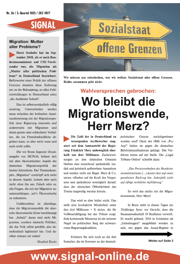 Die Migrationspolitik kostet den Steuerzahler rund 500 Milliarden Euro jährlich. SIGNAL Nr. 36 enthält dazu alle Fakten. Bitte HIER als PDF-Datei laden oder HIER im Onlineformat. Und als Druckschrift zur Weitergabe anfordern!